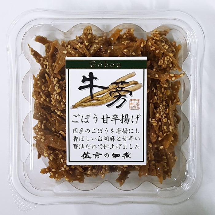 原材料名:ごぼう(国産)、還元水飴、食用油、小麦粉、醤油、ごま、(一部に小麦・ごま・大豆を含む)