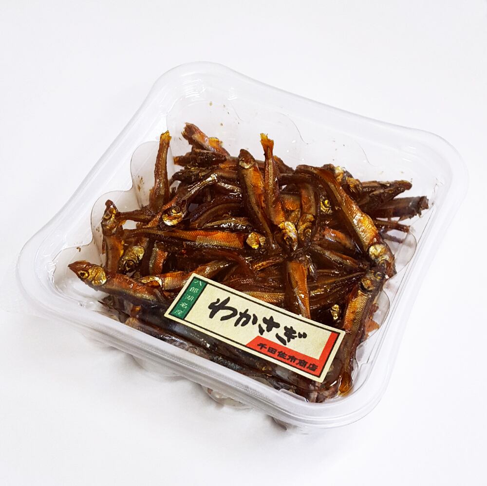 原材料名:わかさぎ(秋田県八郎湖産)、砂糖、醤油、水飴、本みりん、寒天、食塩、(一部に小麦・大豆を含む)