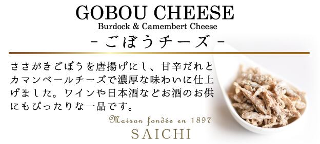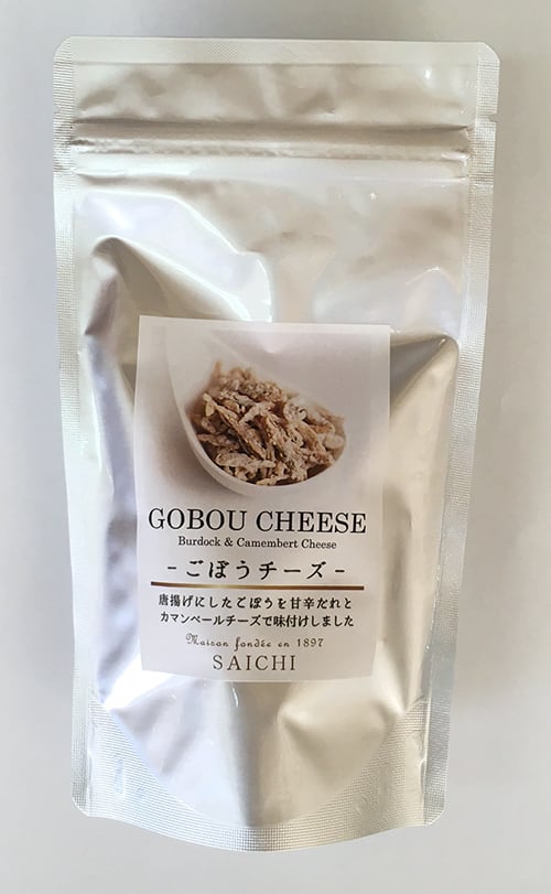 原材料名:ごぼう (国産)、還元水飴、食用油、小麦粉・チーズ、醤油、ごま、(一部
